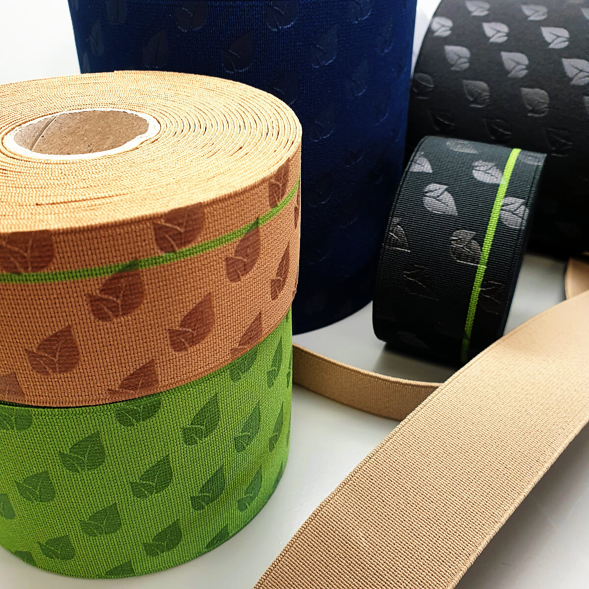 RUBAN ÉLASTIQUE EN POLYESTER RECYCLÉ AVEC IMPRESSION “ÉCO FEUILLE” – 83E
