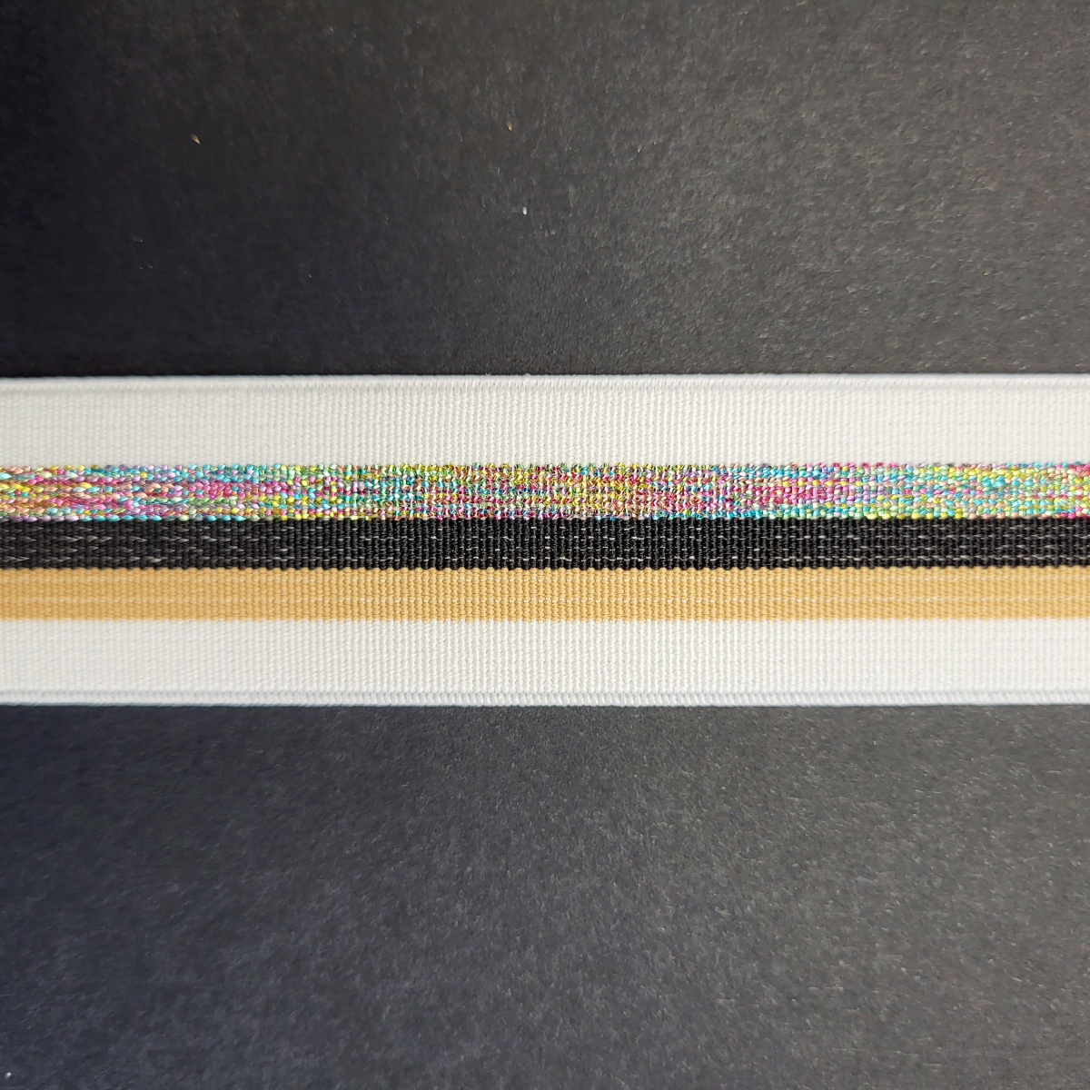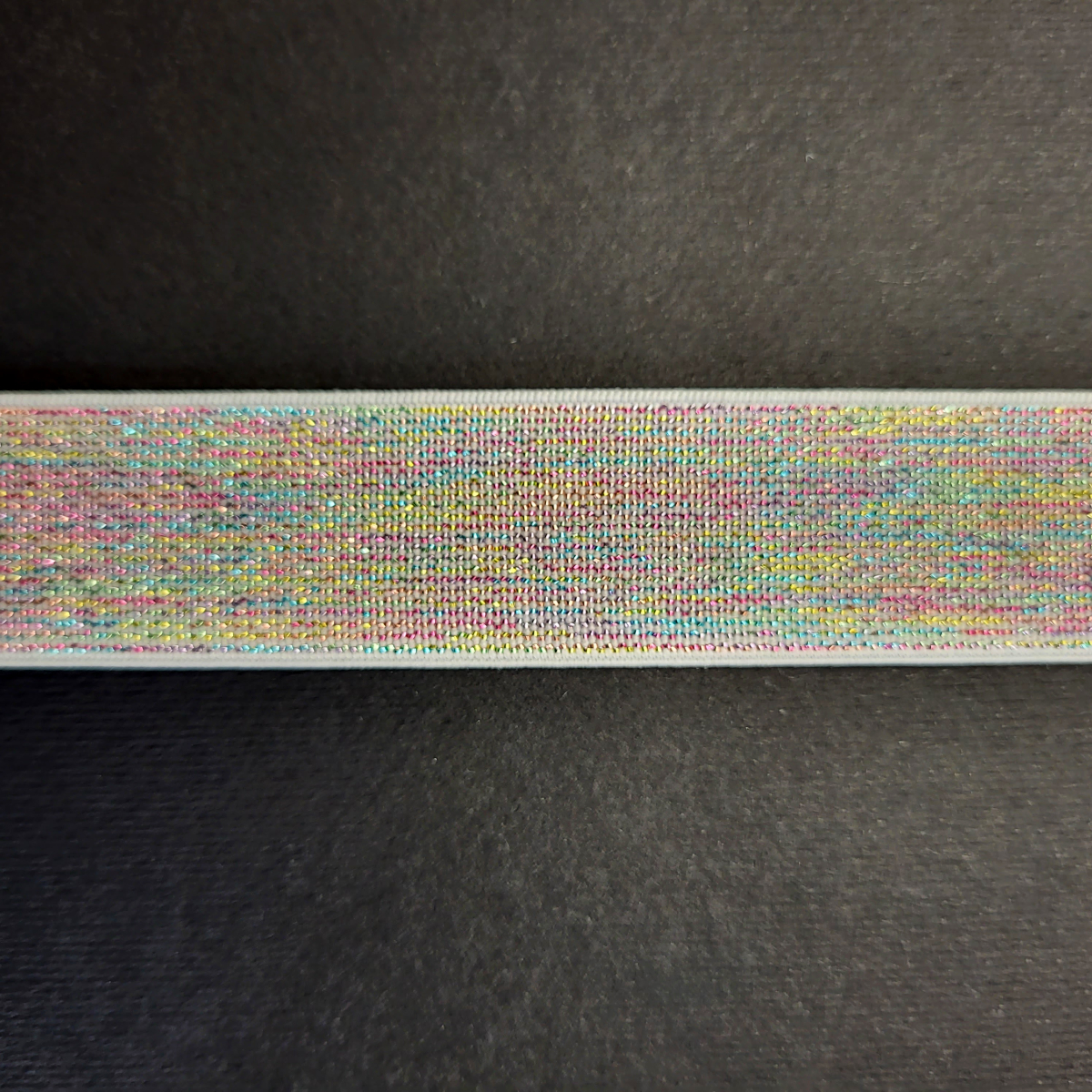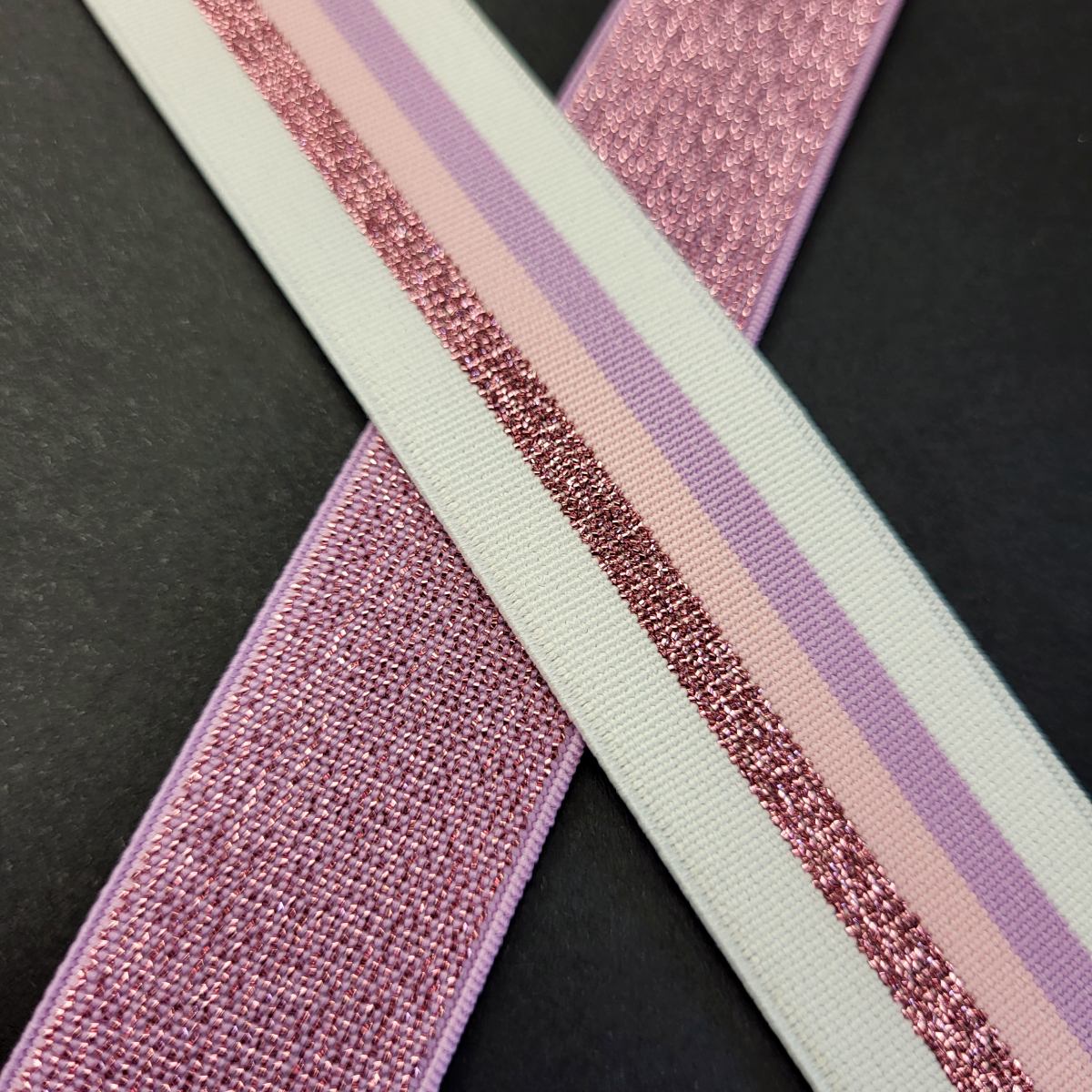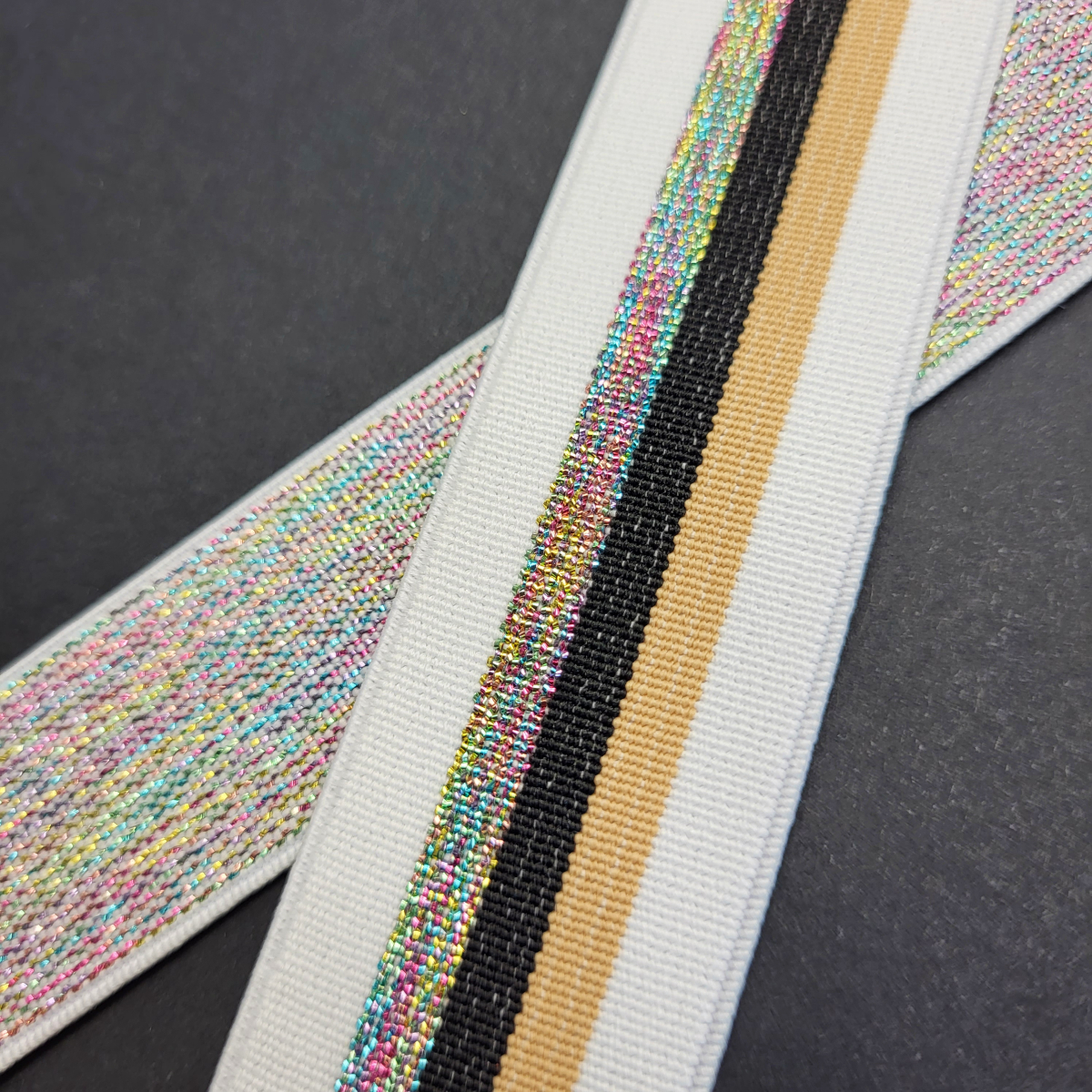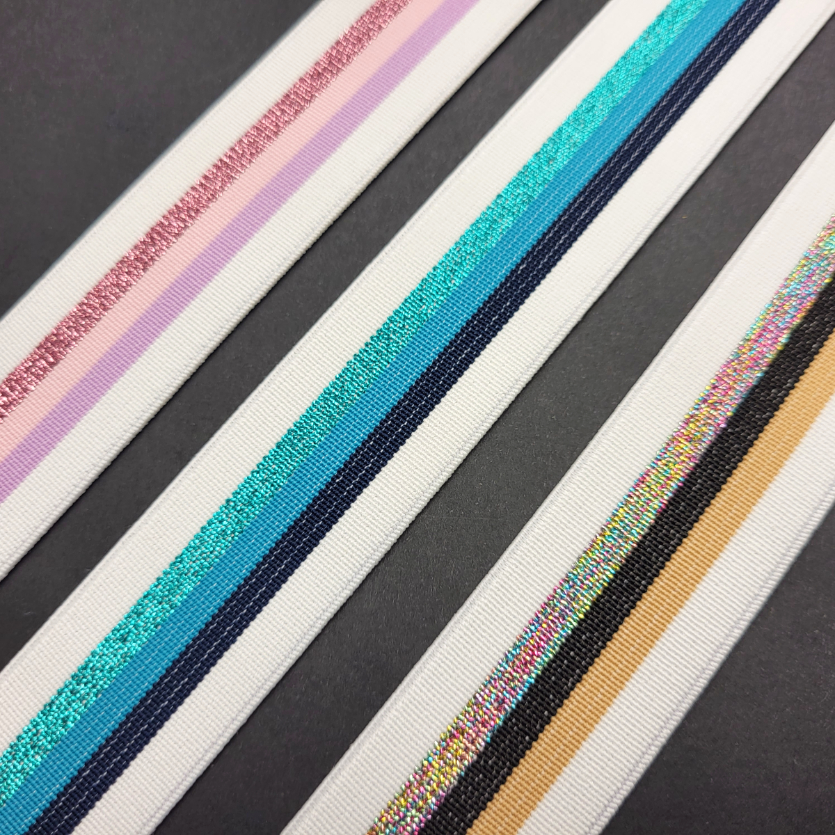 This elastic with Lurex yarn has the same technical specifications of our classic article E3U, with a new range of special colors like the lively Turquoise and Pink and the stunning Cosmos, with its bright, rainbow-like light reflections. These bright shades are perfect eye-catchers, both in plain colors and to create unusual glittered stripes.