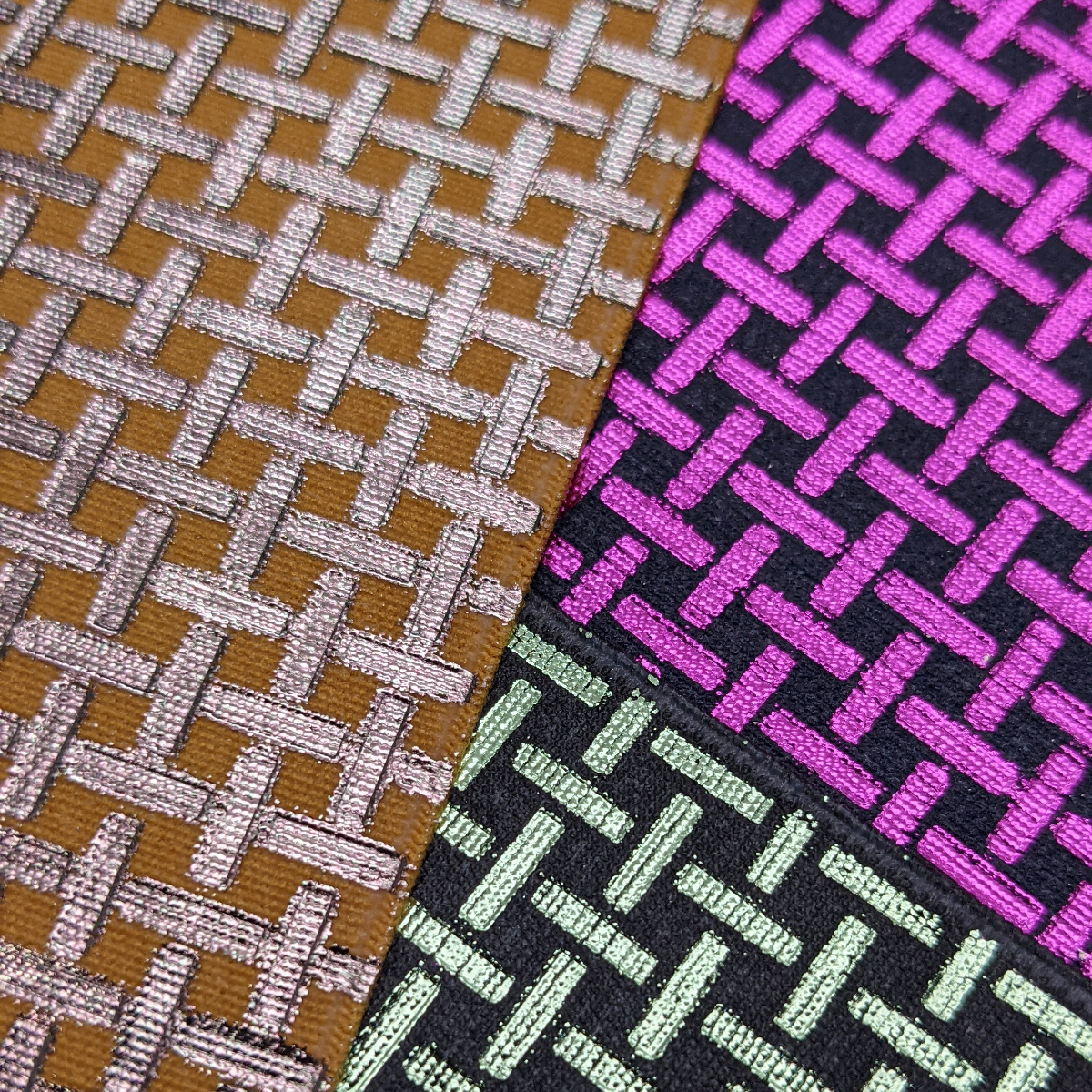 In questi due articoli stampati con foil metallizzato, abbiamo voluto creare dei contrasti di colore forti, prendendo spunto dalle palettes dell’Invernale 2022-23. Il pattern diagonale di SM87 si abbina benissimo con Oro, Rame, Canna Fucile che richiamano al mondo Luxury; mentre l’intreccio di SM77 si presta ad accostamenti decisi e indiscutibilmente Glam con colori come Verde e Fuxia metallizzati.